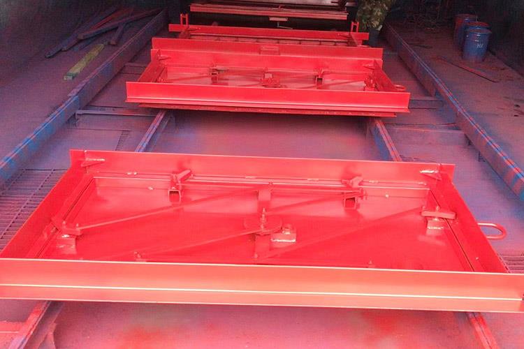 避難硐室密閉門使用對(duì)稱的方式進(jìn)行安裝,它的每一個(gè)安裝件都是使用鋼材料來(lái)焊接成的。避難硐室密閉門的門扇是由井字結(jié)構(gòu)來(lái)進(jìn)行焊接的,反風(fēng)的主要裝置是采用鋼管來(lái)插拴的,安裝的時(shí)候在合頁(yè)處涂上潤(rùn)滑油,保證使用的靈活性。斜風(fēng)井防爆門關(guān)門時(shí),各部件反向擺動(dòng),到關(guān)閉狀態(tài)時(shí)成矩形狀態(tài)。